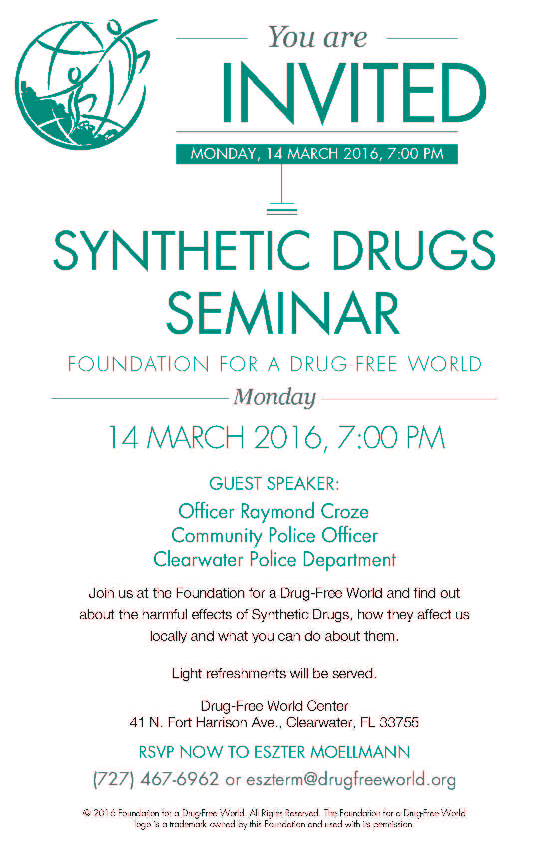 Join us and guest speaker Officer Raymond Croze, Community Police Officer, Clearwater Police Department, at the Foundation for a Drug-Free World and find out about the harmful effects of Synthetic Drugs, how they affect us locally and what you can do about them.